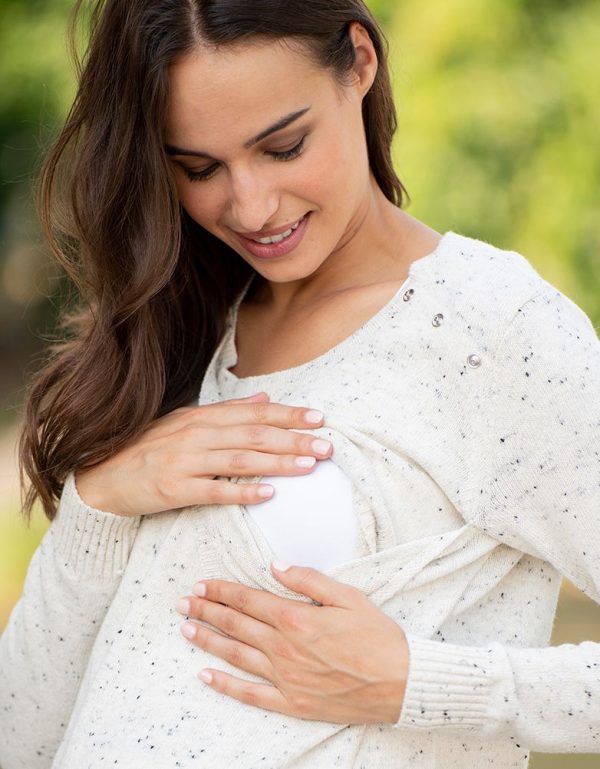 Comfy, cozy & so easy to wear, our Cream Cotton Blend Maternity & Nursing Sweater Dress is a winter wardrobe must-have for moms. This chic cocoon shape dress has been created with the softest cotton blend yarn that stretches as your bump grows without ever losing its shape. This means you can keep on wearing it long after baby arrives, and sleek metal snaps open up at the shoulders for fuss-free nursing access. Team with your favorite leggings for easy off-duty style.